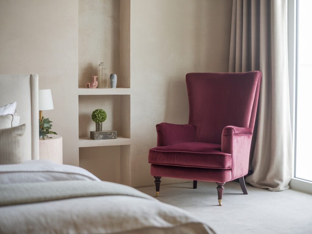 1: Bold Velvet Armchair in a Neutral Bedroom