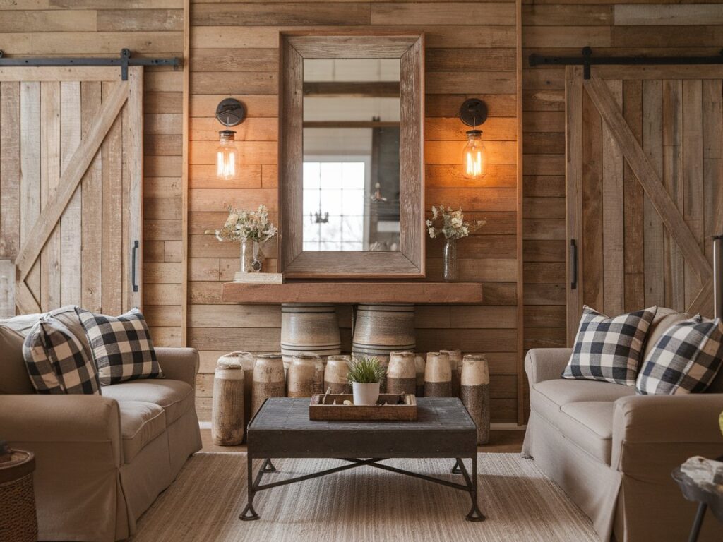 9: Rustic Living Room with Mirror and Mason Jar Sconces