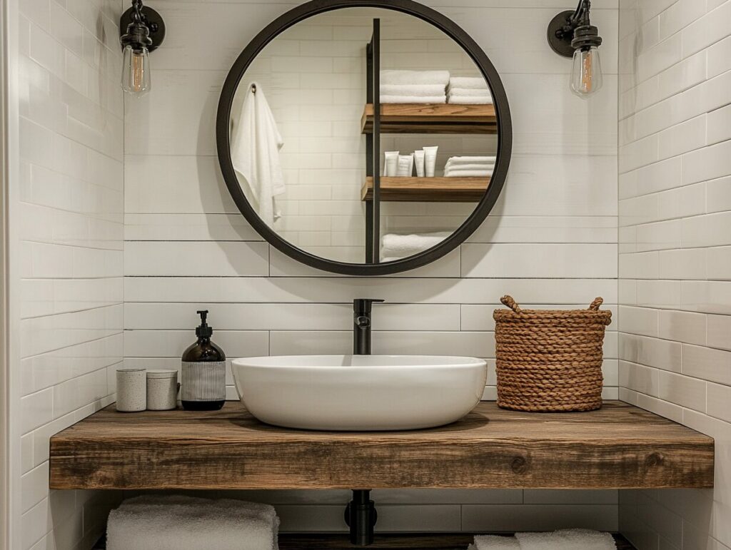 3: Modern Farmhouse Bathroom with Round Metal-Framed Mirror