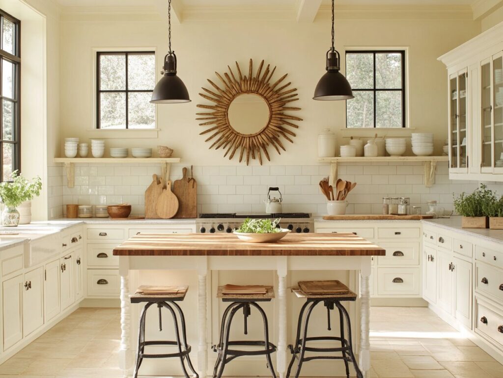 5: Bright Farmhouse Kitchen Accented by Sunburst Mirror