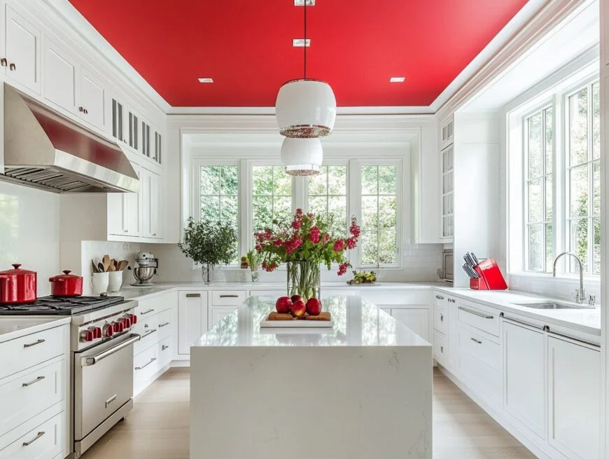 8: White Kitchen with Bold Red Ceiling