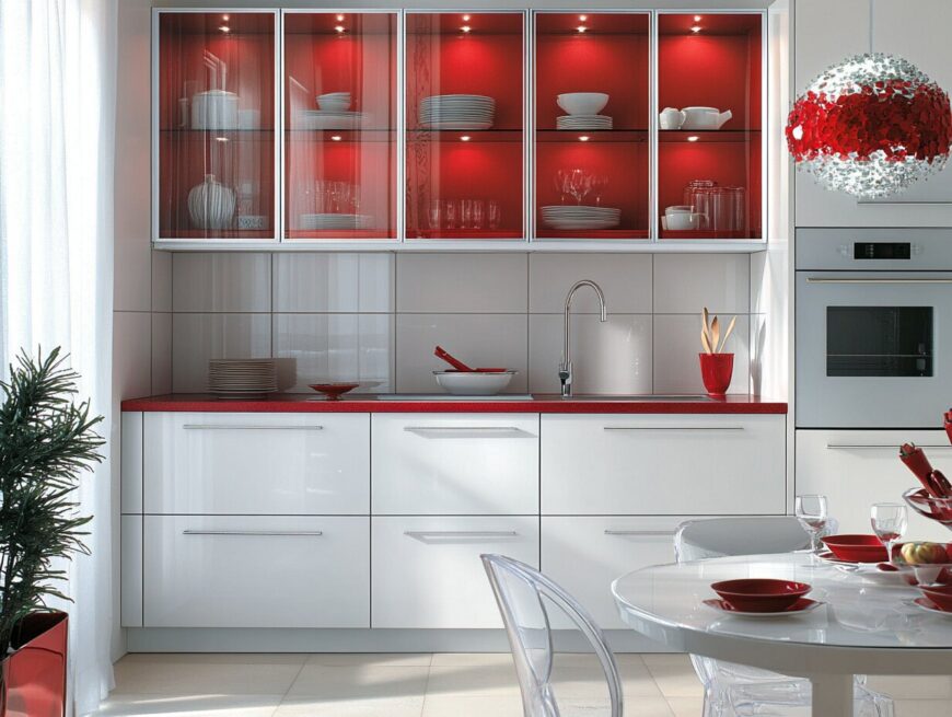 9: White Kitchen with Red Glass Cabinet Doors