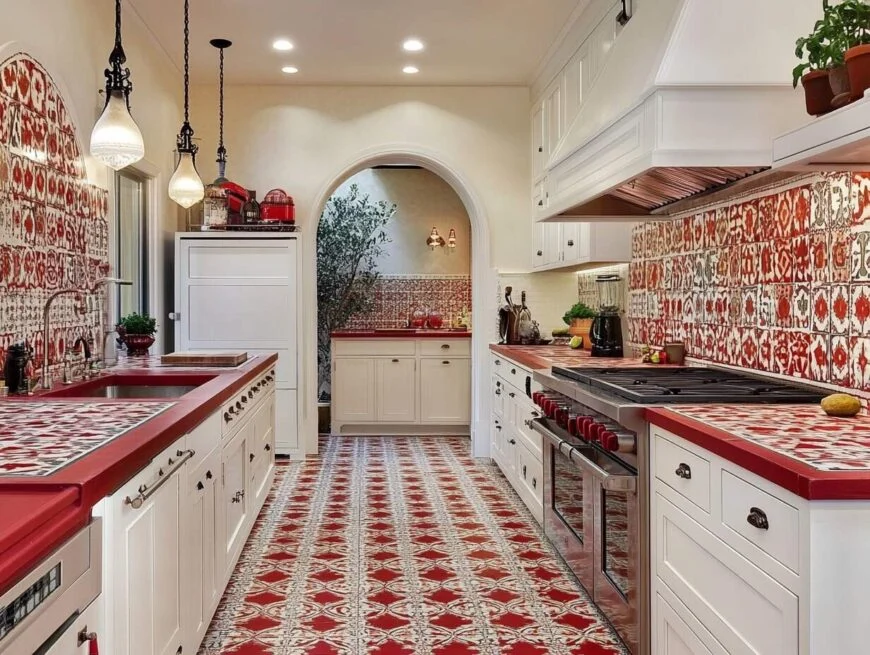 10: Eclectic White and Red Patterned Tiles in Kitchen