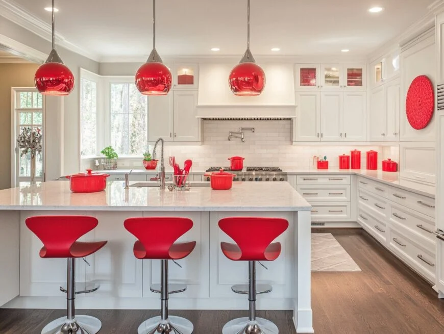 A white and red kitchen delivers eye-catching contrast while remaining timeless and welcoming. The clean brightness of white paired with vibrant red can create a polished modern vibe or evoke a hint of retro flair, depending on your style.