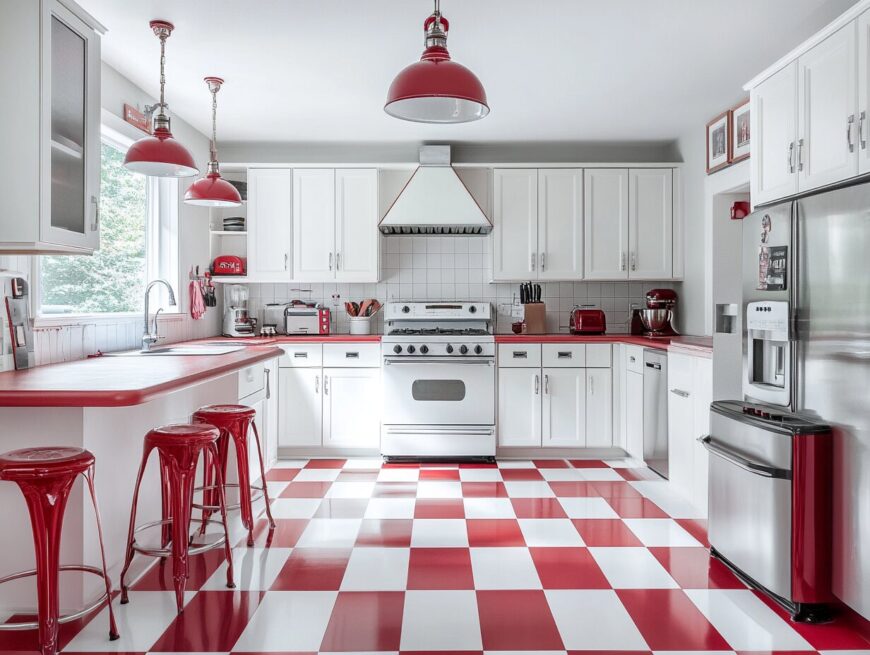 6: Red and White Checkerboard Floor Kitchen